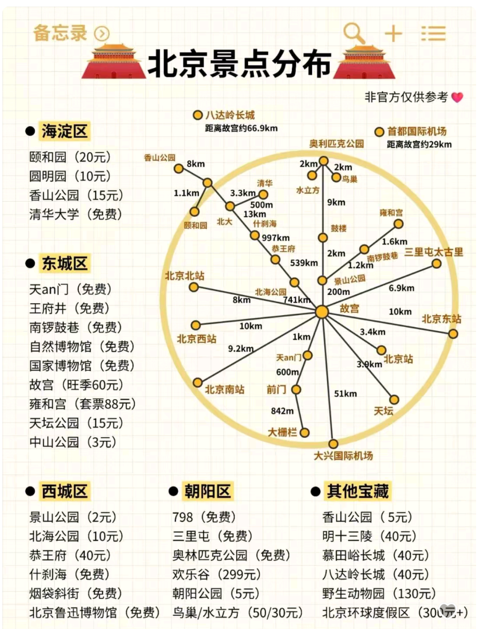 - 住宿:市中心(东城区、西城区)便于观光;海淀适合学术/科技区游玩。